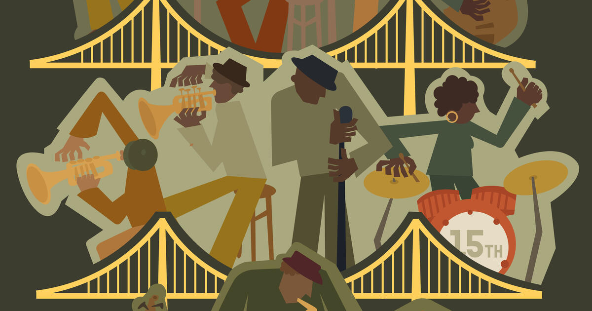 Limena also thought carefully about the dynamism of jazz in her composition. “The groups are arranged in common instrument pairings for jazz trios and quartets, but I wanted the rhythm of the music to be felt off the page. That’s why each person is oriented in a different direction with abstract, jutting out limbs and pointed instruments—it sharply invites the viewer’s eyes from every angle and dances off the page,” she said. Her palette, with “rich saffron oranges and bright yellows to evoke its energy and warmth, balanced with deep, earthy greens that reflect the human element of the genre,” reinforces that sense of movement. A subtle “15” hidden on the drum nods to the milestone anniversary.